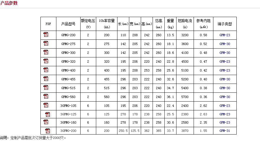 容量范圍(C10):105Ah~560Ah(25℃);